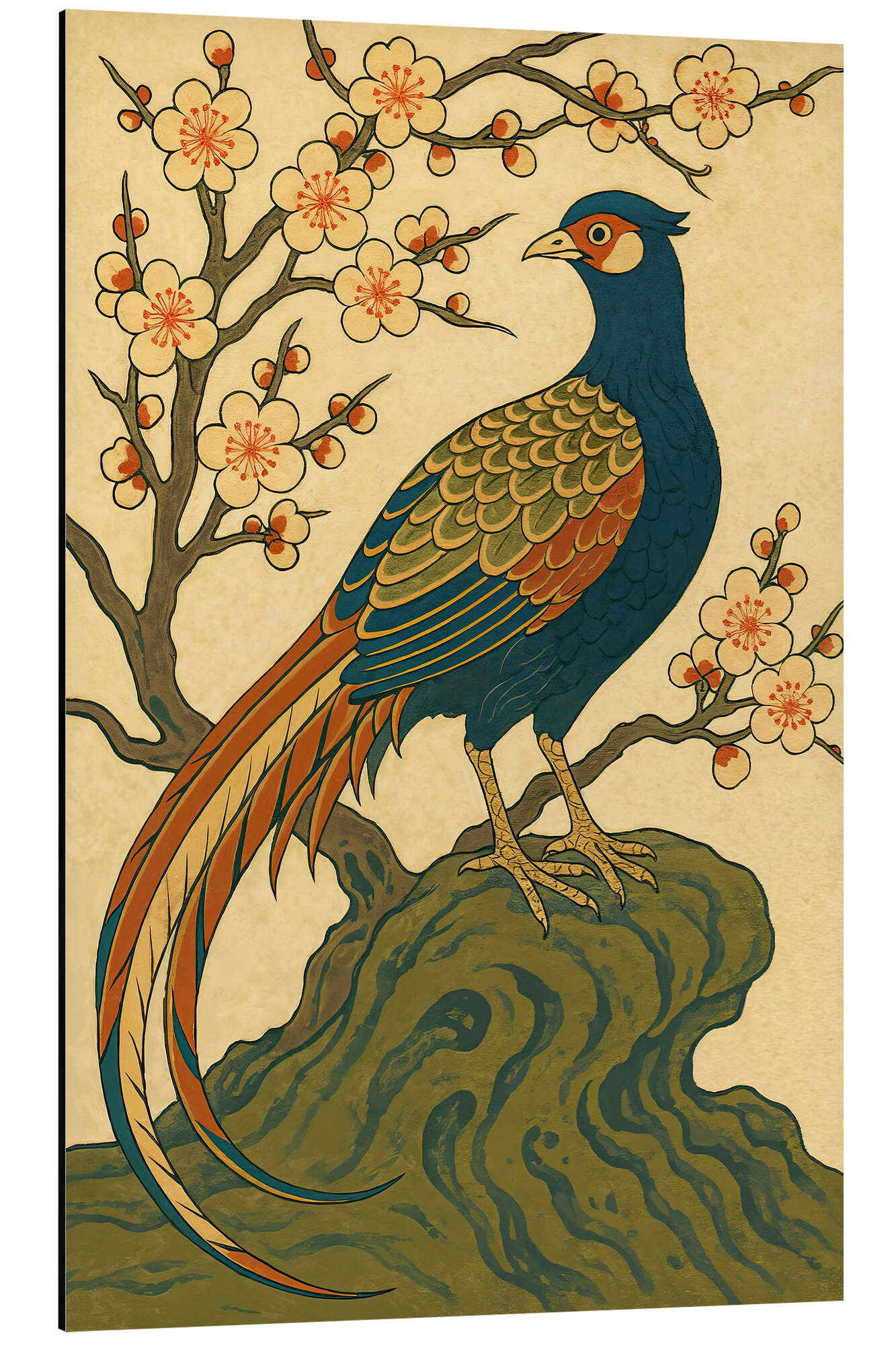 Posterlounge   Taulut   Eläimet   Linnut   Riikinkukot   Natalie Bruns   Alumiinitaulu Japanese pheasant on rock with plum blossoms